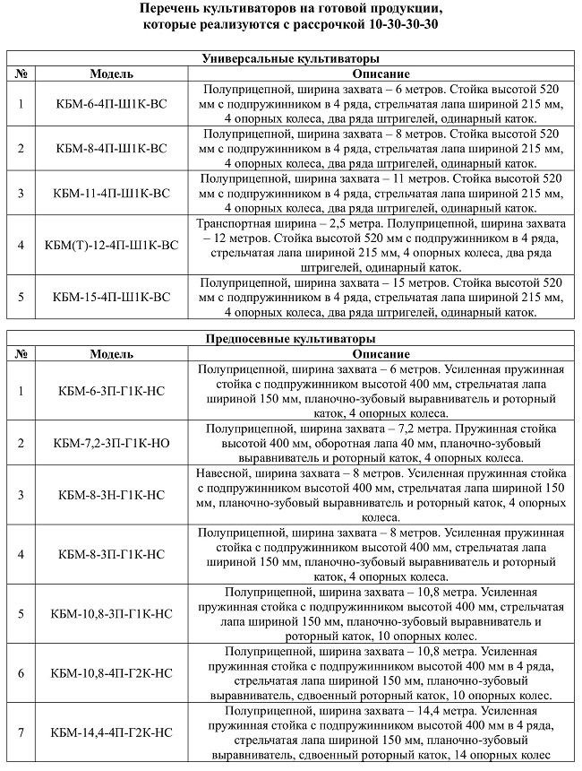 Компания ООО «АПК «АБА» официальный дилер завода «ЯРОСЛАВИЧ» предлагает приобрести культиваторы КБМ из наличия готовой продукции на складе завода по специальному предложению оплаты с рассрочкой. Внесите аванс 10% от стоимости культиватора и далее платите равными суммами 30, 30 и 30% до конца года. Перечень культиваторов, которые участвуют в акции указаны в приложении. Предложение действует с 1 сентября по 31 декабря 2025 года.