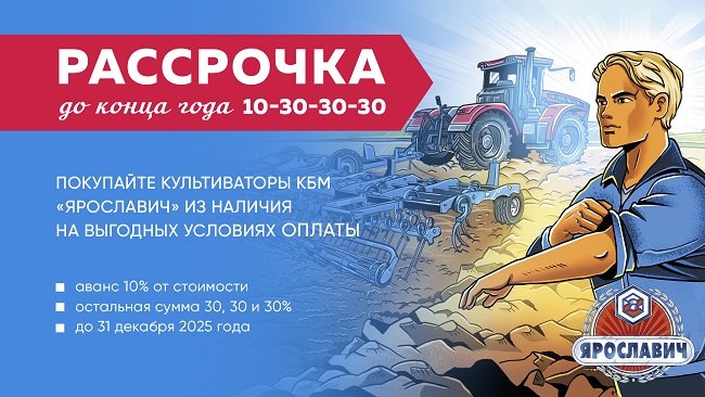 Компания ООО «АПК «АБА» официальный дилер завода «ЯРОСЛАВИЧ» предлагает приобрести культиваторы КБМ из наличия готовой продукции на складе завода по специальному предложению оплаты с рассрочкой. Внесите аванс 10% от стоимости культиватора и далее платите равными суммами 30, 30 и 30% до конца года. Перечень культиваторов, которые участвуют в акции указаны в приложении. Предложение действует с 1 сентября по 31 декабря 2025 года.